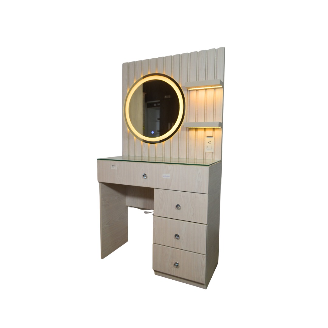 Renueva tu rutina diaria con este tocador de melamina de 90 cm que combina diseño moderno, excelente capacidad de almacenamiento y un espectacular panel con luces LED. Ideal para dormitorios modernos, es perfecto para maquillaje, cuidado personal o decoración.